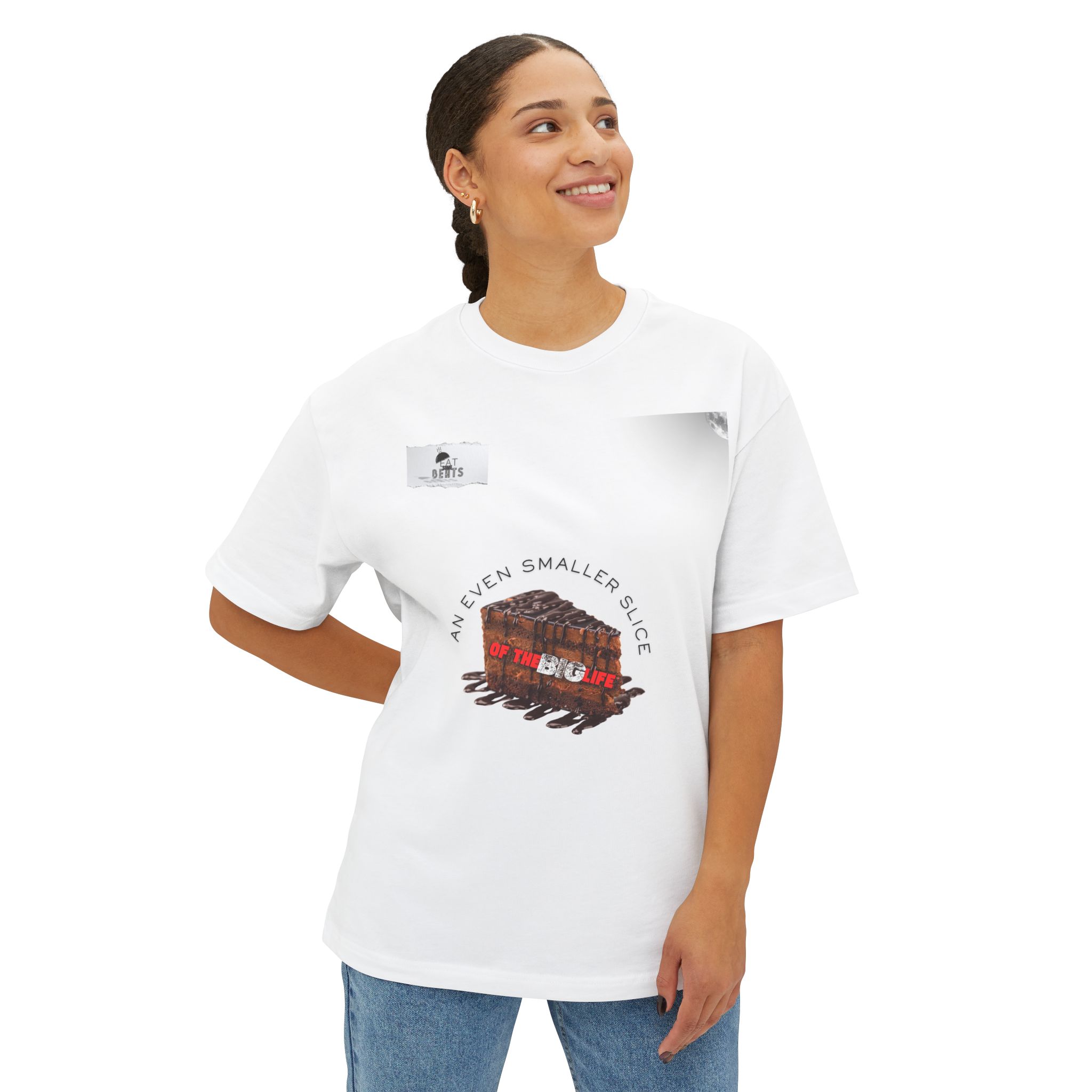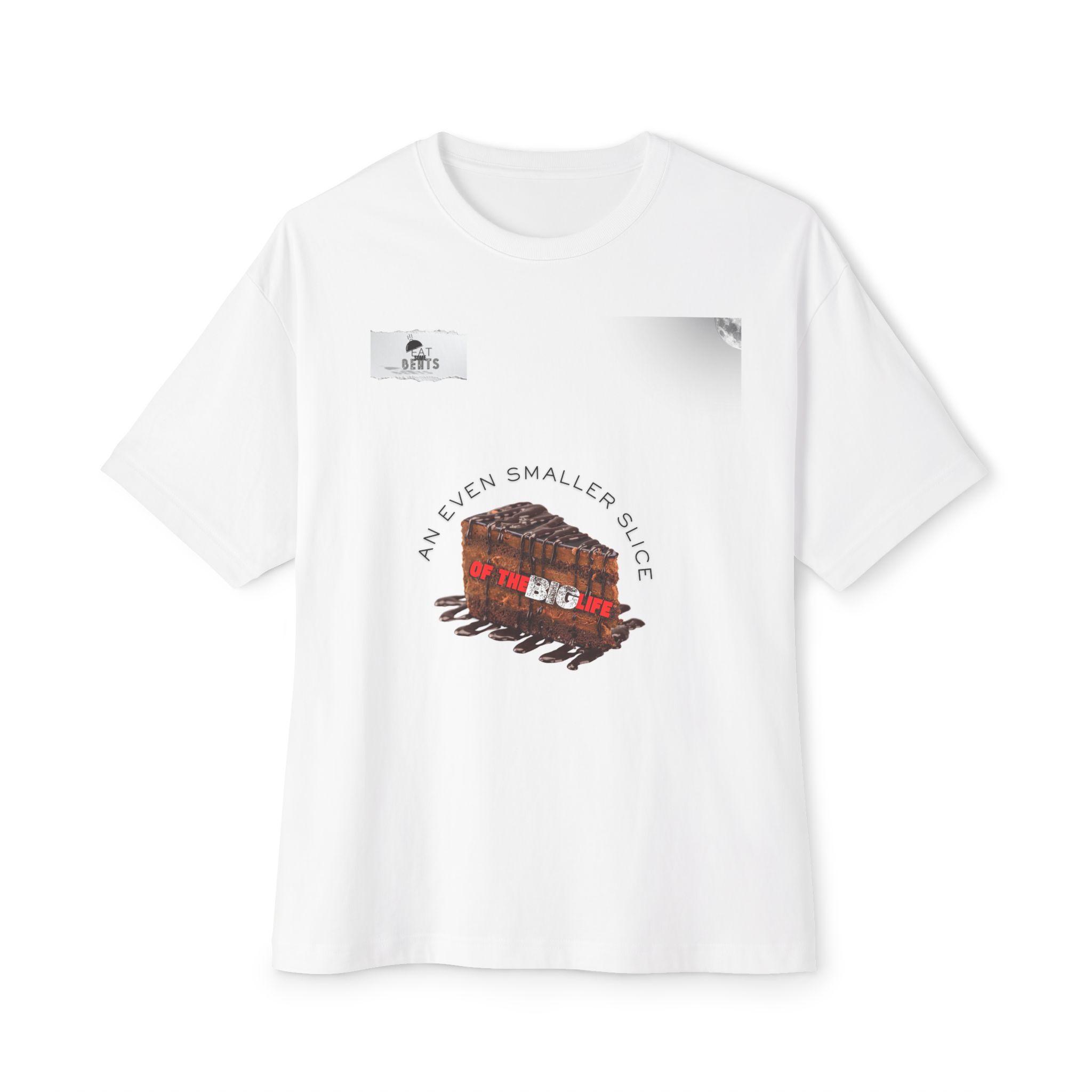 This oversized boxy tee carries a quiet, offbeat humor — a tiny slice of retro diner pie and a wink of nostalgia printed slightly askew on a roomy white canvas. The relaxed silhouette and dropped shoulders let the design breathe, while the medium-weight, combed cotton feels soft against skin and holds its shape through days of lounging, walks, and coffee runs. Wear it when you want something comfortable with personality: it pairs effortlessly with worn jeans, high socks, and that slow, easy Saturday energy. The subtle, hand-drawn illustration and curved caption invite a smile without shouting, making this shirt a low-key statement for people who appreciate small, clever details and a laid-back, familiar vibe.