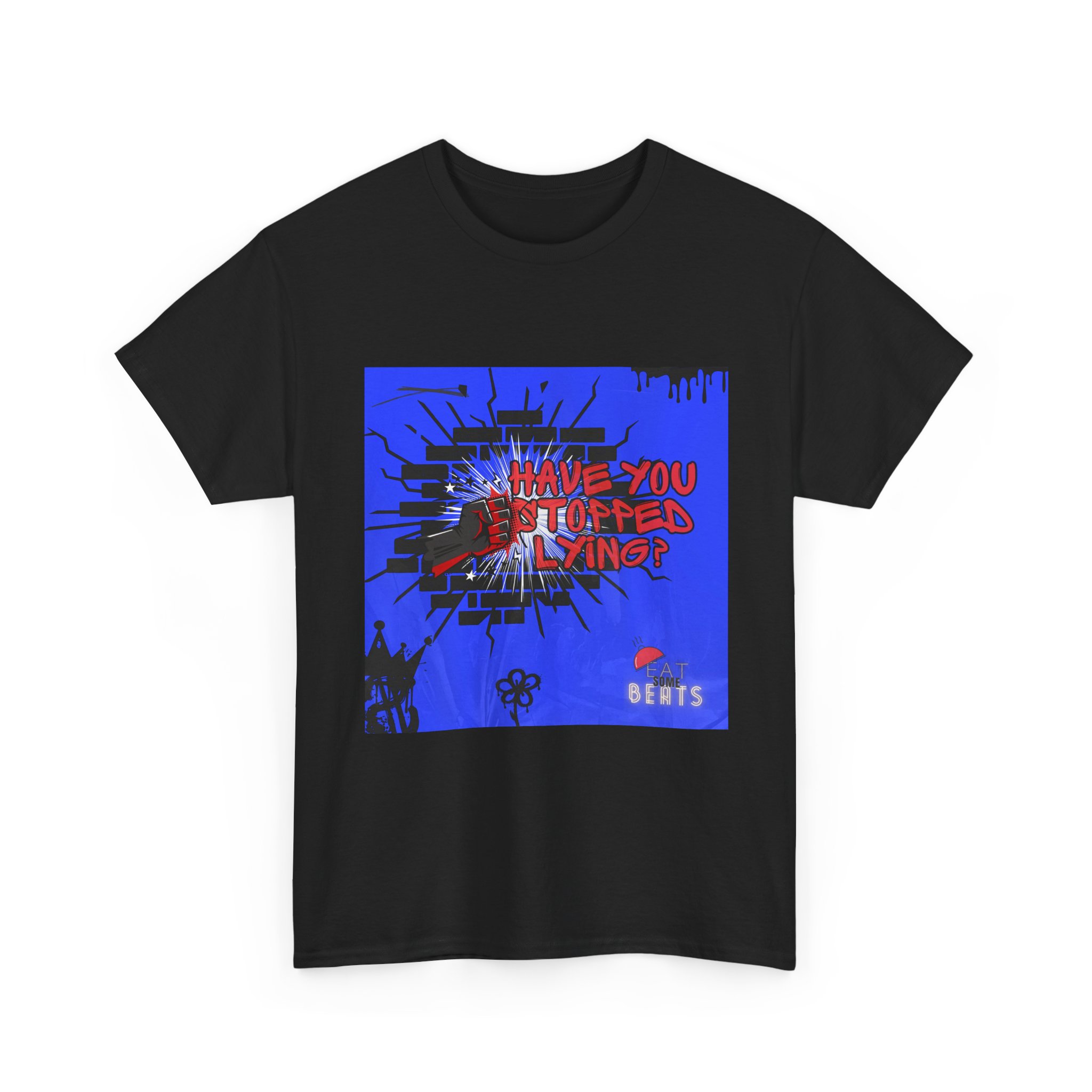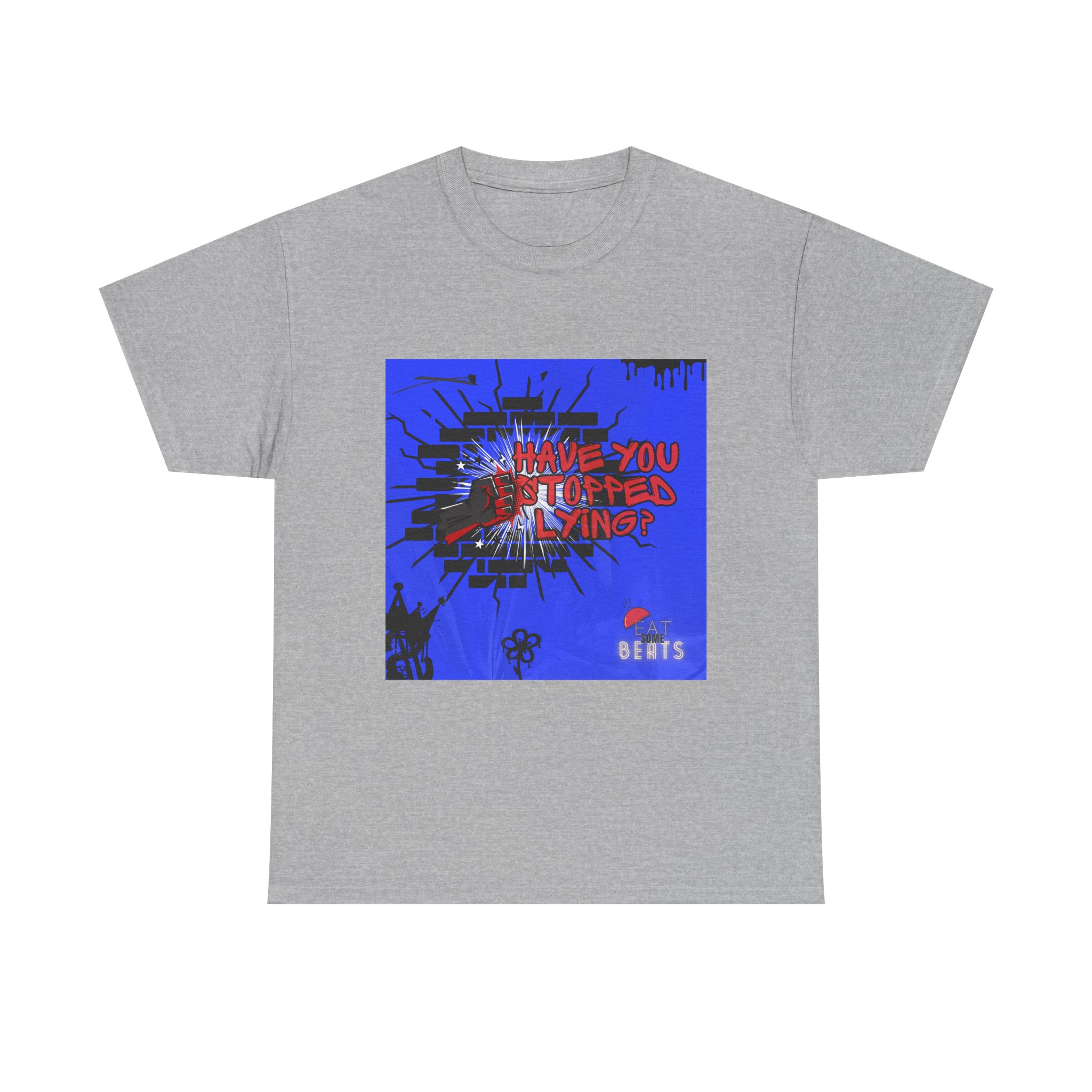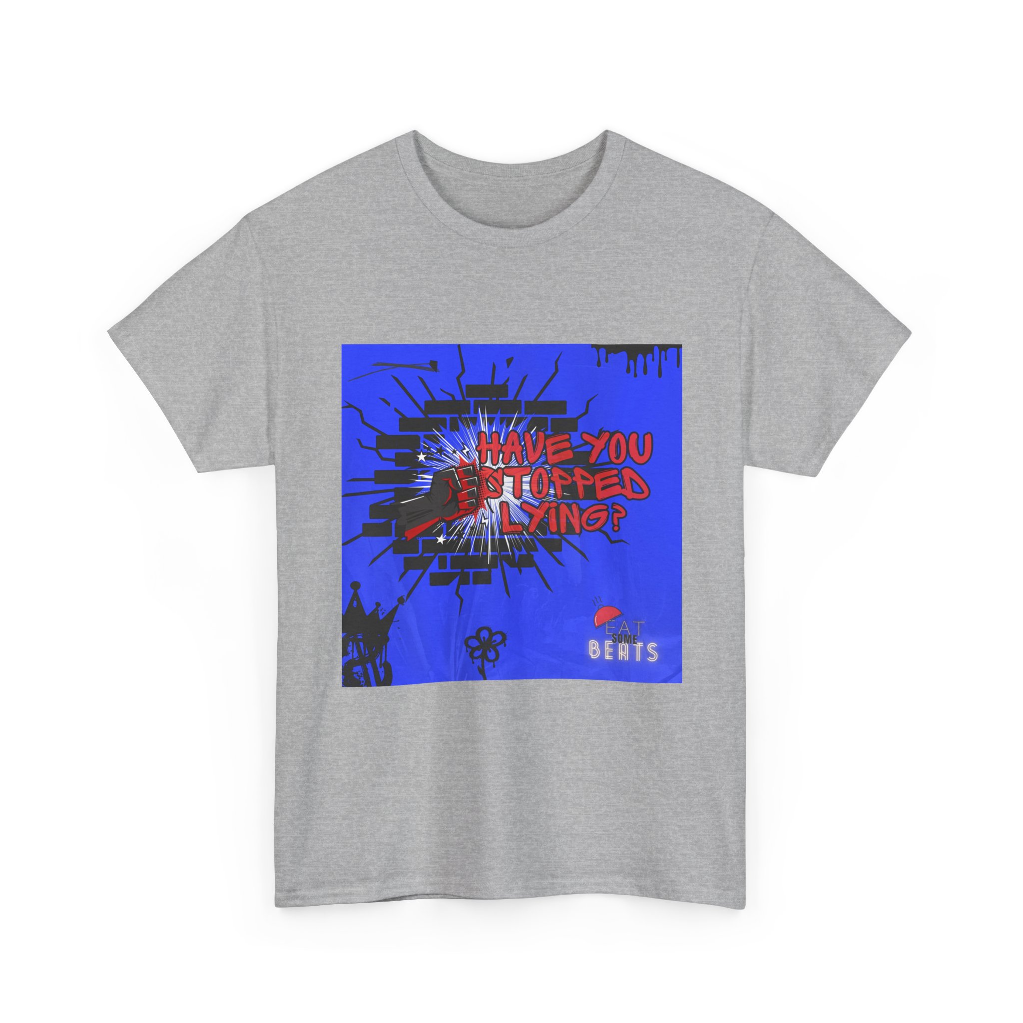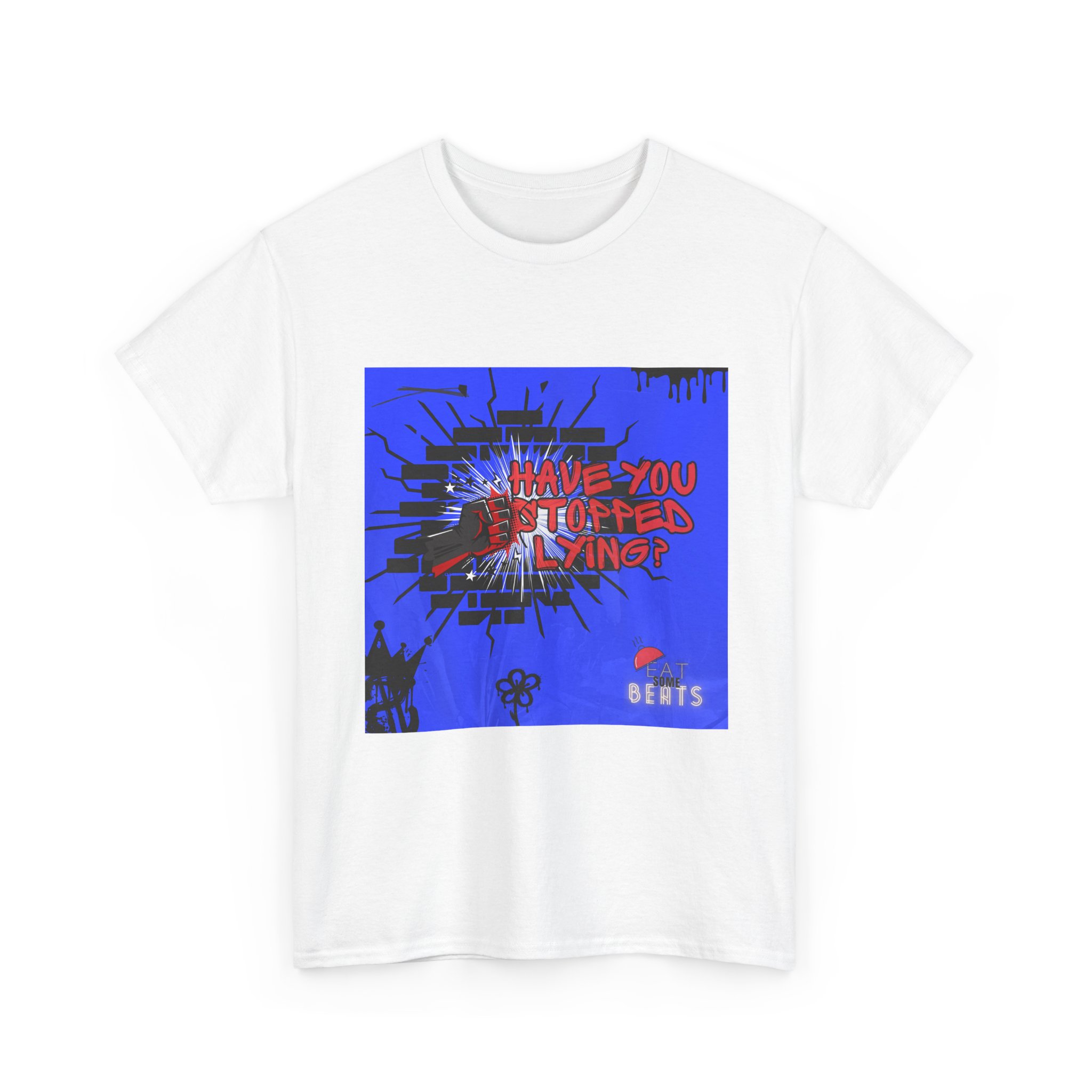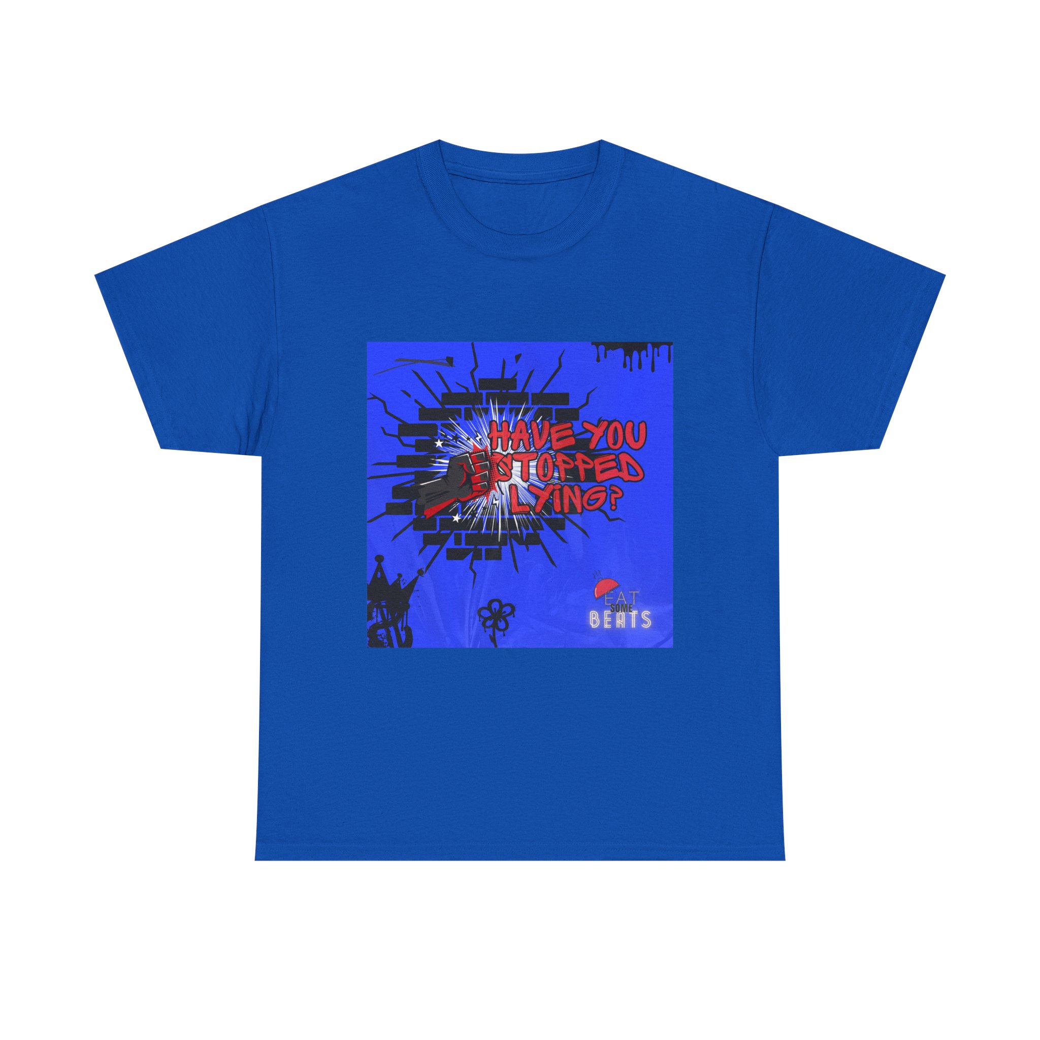 A bold, streetwise tee that speaks with attitude. This classic crewneck shirt carries an eye-catching graphic—electric blue background, splattered black accents, and striking red hand-lettered text asking, “Have you stopped lying?”—that reads like a midnight poster on an urban wall. The relaxed fit and smooth, durable cotton feel comfortable for long days and late nights. Wear it to shows, protest walks, or when you want your outfit to do the talking: raw, direct, and a little confrontational in the best way. The print techniques keep the design crisp and vivid; the tear-away label and ribbed collar keep the wear comfortable. It lives in playlists, basements, and city corners—where honesty (and noise) matter.
